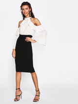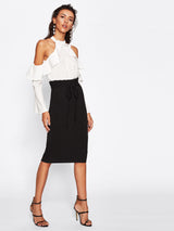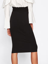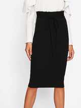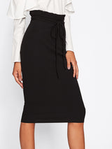 The polished and elegantly designed pencil skirt fit for work and smart casual dress, the Mademoiselle skirt has a frill waist panel with lace tie-up design, a knee length pencil skirt silhouette with a hidden zip enclosure. Wear with your white button up and black heels.