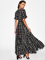 Medium weight dress with a square mosaic tiled print design throughout. The patterned dress features a crew neckline. sleeves with slight feminine ruffles and a panelled long skirt. Comes with a matching removable waist tie.