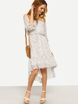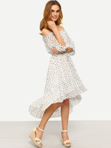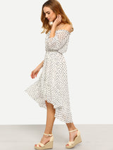 This dress is effortlessly chic, sporting crescent-like polka dots throughout. It is playfully sheer layered with a soft white lining. Elasticated edges with ruffles for the added feminine touch, an elasticated tie waist to catch your waist and a fall trail skirt to finish. Pair the Loretta dress with wedges or tan heels for you next weekend out.