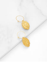 The Auric earrings feature a small hoop style with religious brooch drops attached. A clean golden statement to finish off your casual day or night style attire.