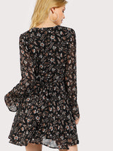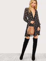 The perfect long sleeve dress for the cooler season. Autumn floral prints with a vocal v-neck plunge for room to accessorize (or not!). This Black floral dress features a gathered flouncy sleeve. Elegant yet tempting, this long-sleeved floral dress is sure to allure spectators. Show off your pretty floral personality at a casual dinner/party or be captivating yet classy at your next event.