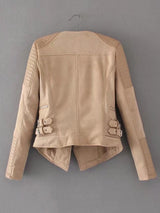 The Beige layered biker jacket features PU leather and suede throughout. It shows distinctive details in its puffy linear stitching, collarless lapel neckline, double front layering, zipper enclosure, and pockets. Wear yours with light coloured jeans and heels.