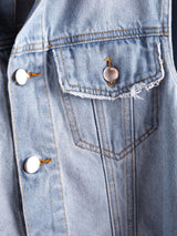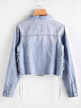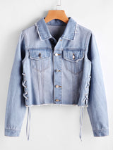 The ideal explorative jacket for when you are strolling the streets of beautiful architectural buildings along the river and smelling the earthing smell of fresh coffee and flowers on a Sunday morning. Features a regular constructed denim jacket with raw edging, front flap pockets and side seam openings with denim lace-up detail. Just a little bit distinctive.