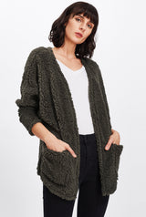 The Fern teddy coat is a warm fuzzy open coat with magyar sleeves two front pockets. An easy slip on slip off piece for the chilly days.
