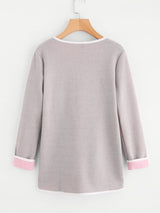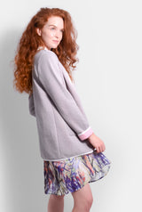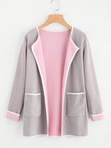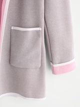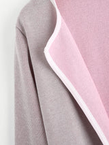 The Harmony knit coat features a 2-tone style of grey and pink with contrast edging and two front pockets with a collarless shawl neckline. A Harmonious colour scheme to compliment your outfit!