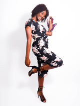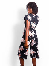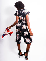 A soft detailed outfit to enjoy the sunny days, the Suave playsuit features a wrapped front, oversized capped sleeves, a waist tie and a capri style pant. A dark vintage style print to compliment your dainty wardrobe. Wear yours with black or tan accessories.