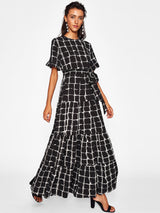 Medium weight dress with a square mosaic tiled print design throughout. The patterned dress features a crew neckline. sleeves with slight feminine ruffles and a panelled long skirt. Comes with a matching removable waist tie.